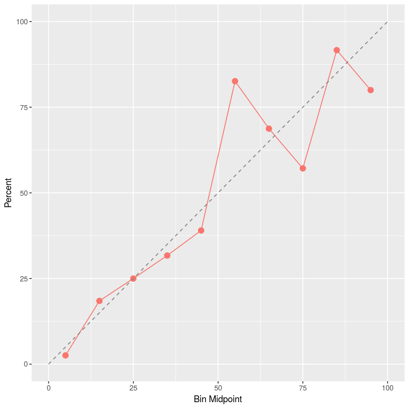 또한 Calibration Curve는 범주별로 신뢰구간의 extract binomial test를 기반으로 신뢰구간을 추정하여 제시할 수 있다.