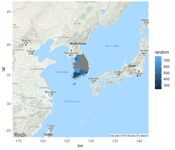 ggmap(map)+geom_polygon(data=shp3,aes(x=long,y=lat,group=group,fill=random))+scale_fill_gradient(limits=c(250,750))