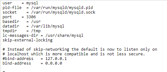 /etc/mysql/mariadb.conf.d 경로의 50-server.cnf에서 bind-address 를 0.0.0.0으로 변경해준다.